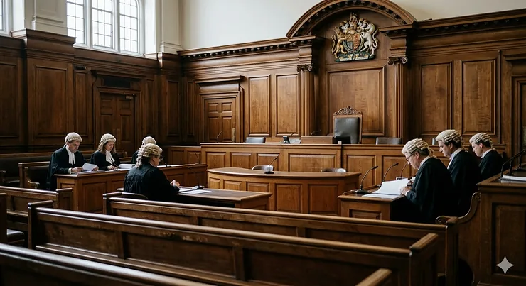 A wide, photorealistic view of a wood-panelled British Crown Court interior with barristers in traditional wigs and gowns seated at their desks under natural light from high windows.